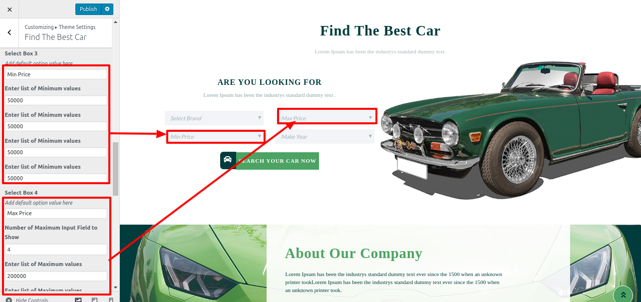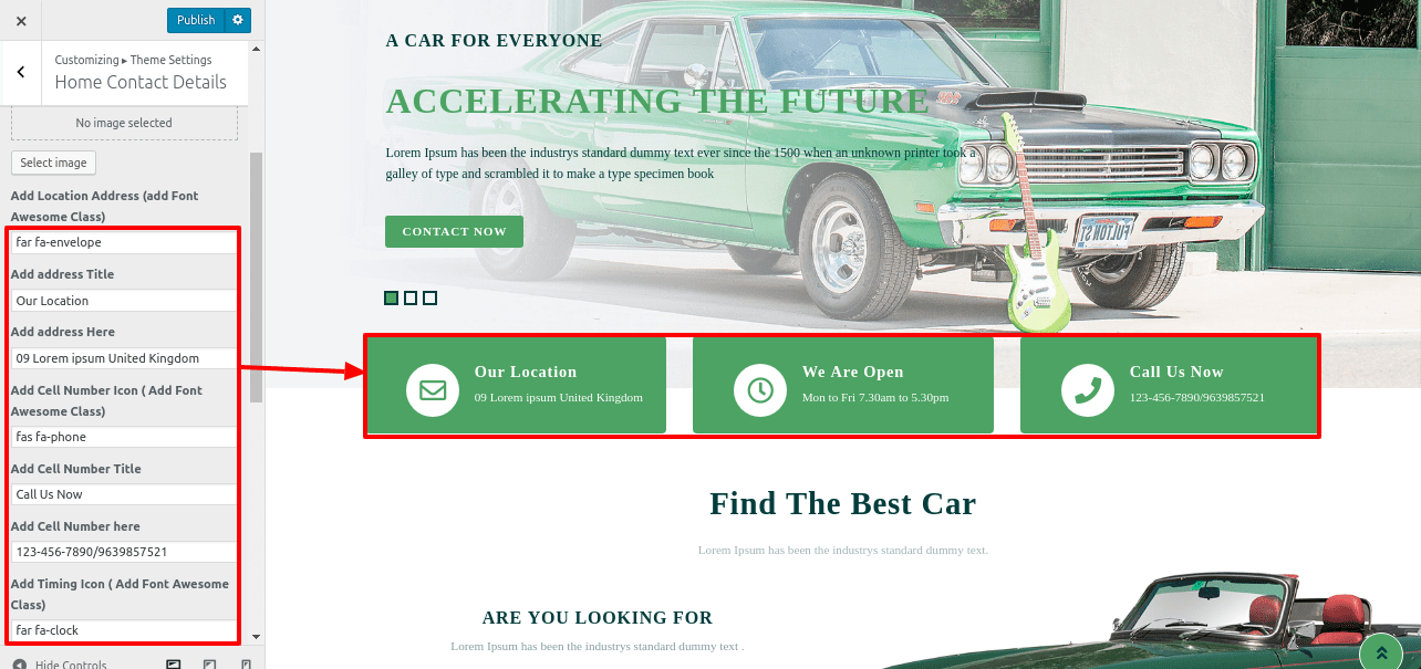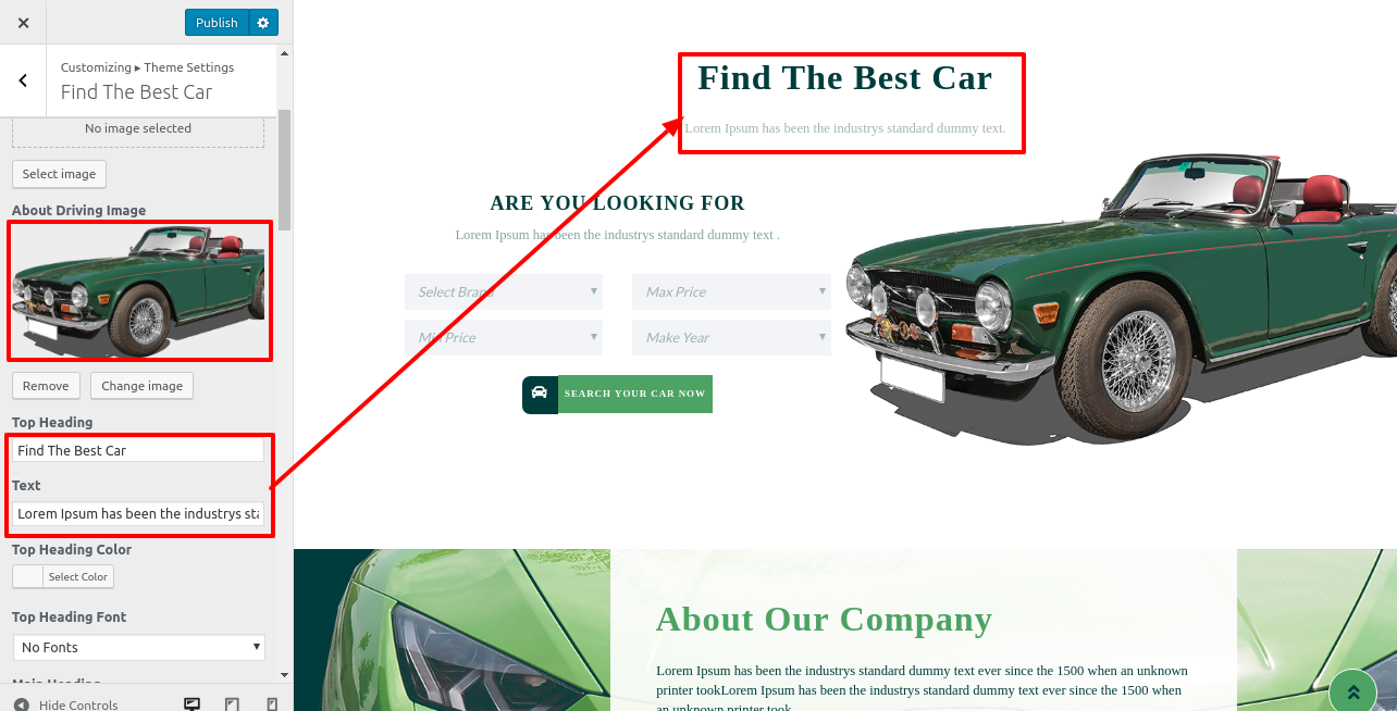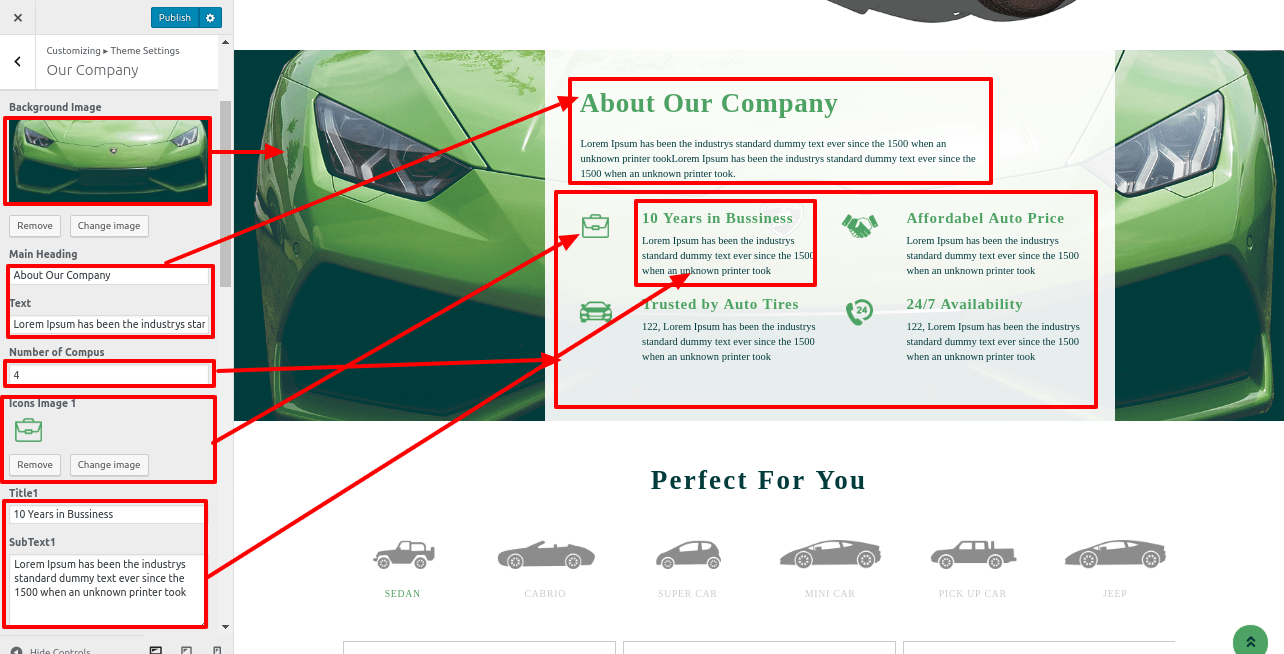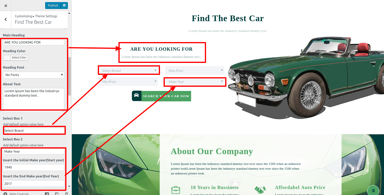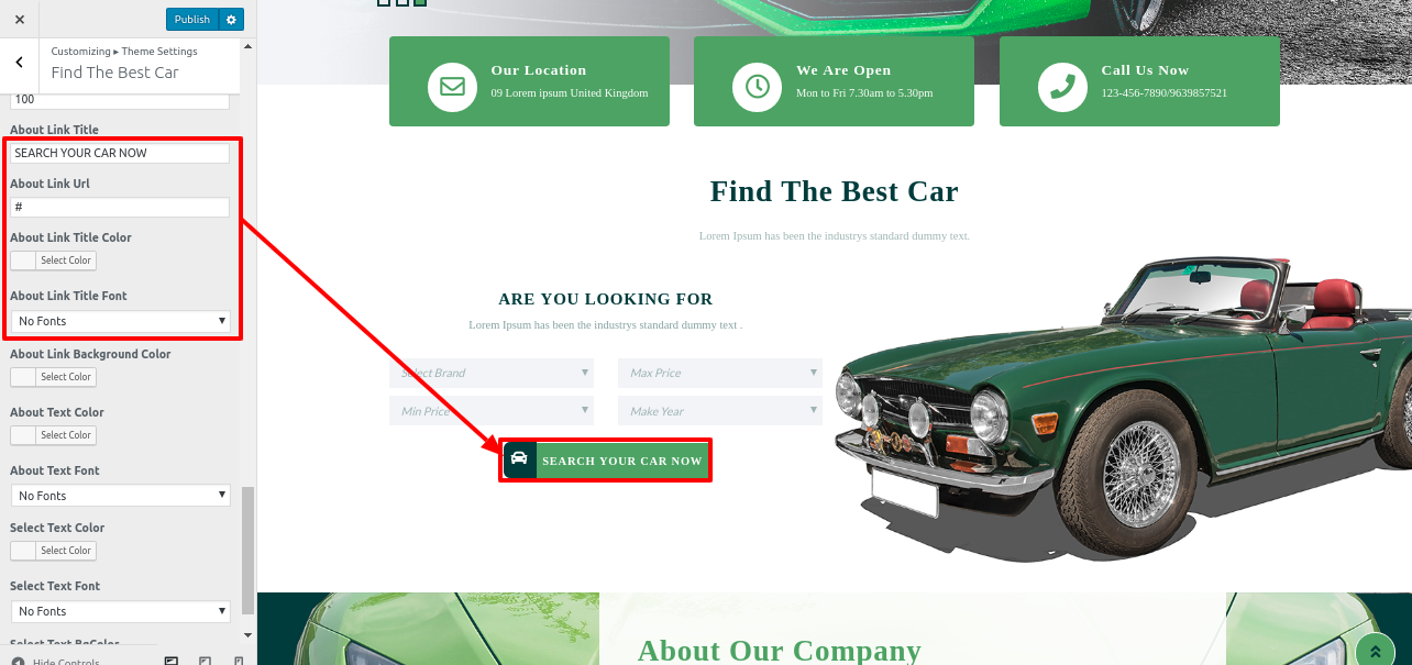In order to proceed this section, Go to Appearance >> Customize >> Theme Settings >> About Cars.