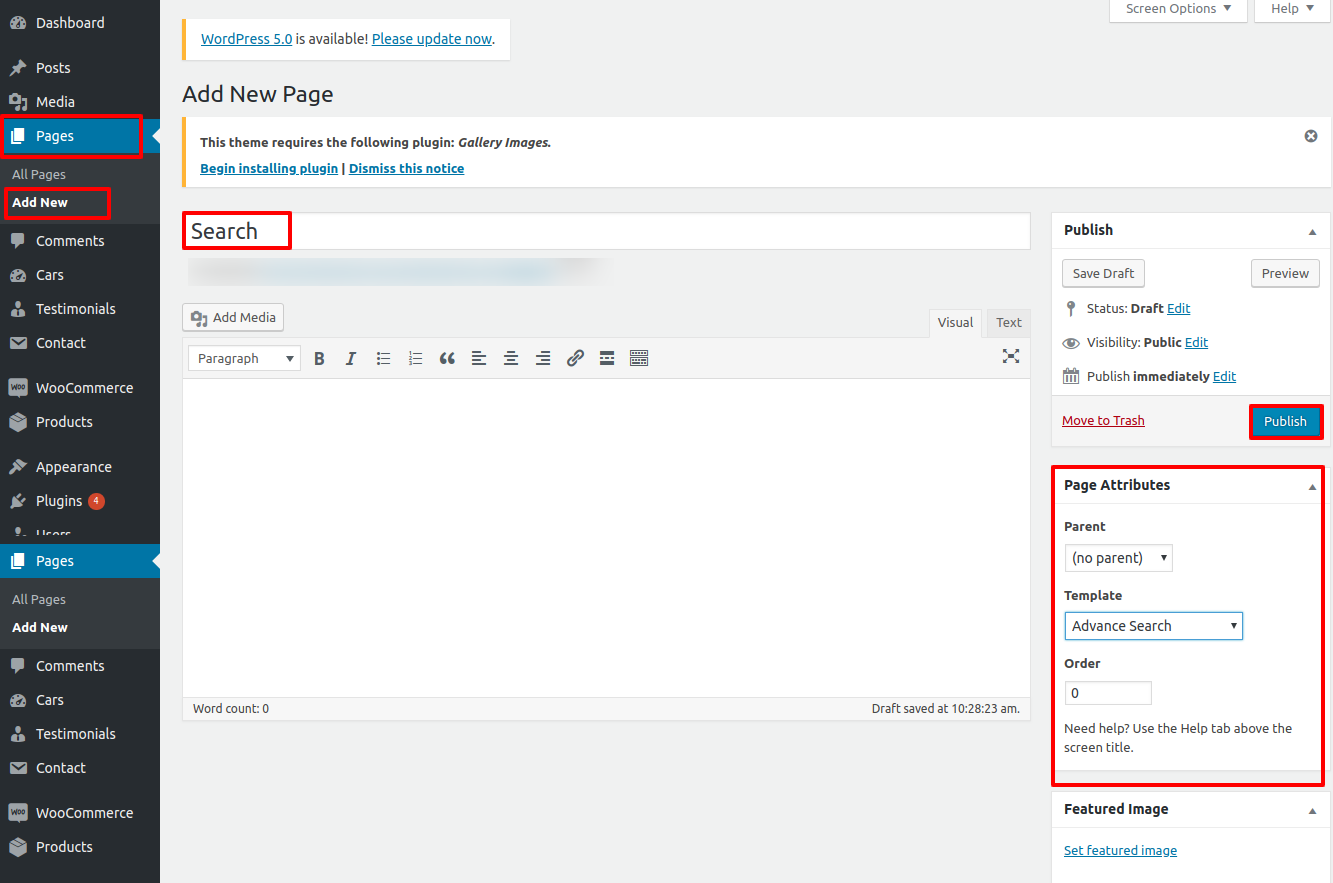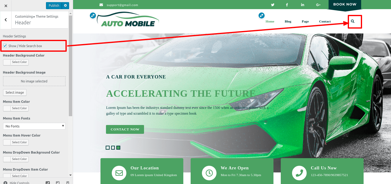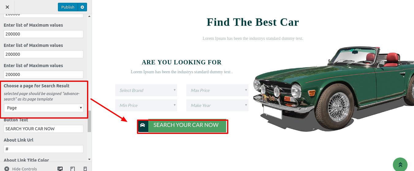 Create a Search Page in Customize >>Theme Settings >>find the best car >> Choose a Search page.
