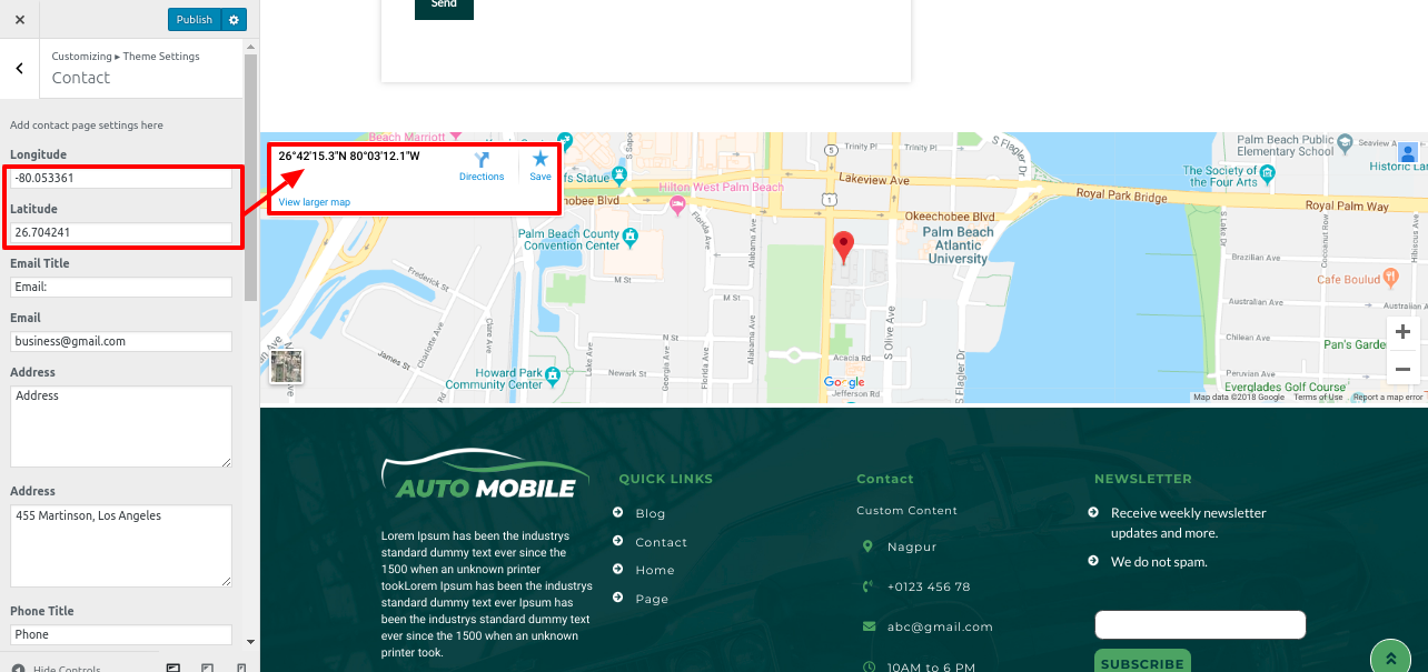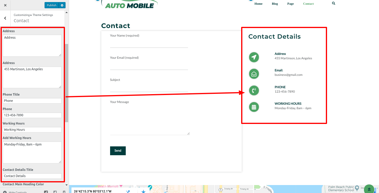 Go to Appearance >> Customize >> Theme Settings >> Contact.