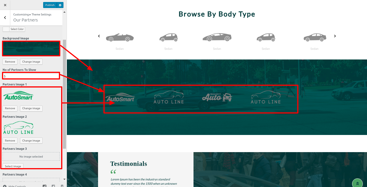To proceed with this section, go to Appearance >> Customize >> Theme Settings >> Our Partners.