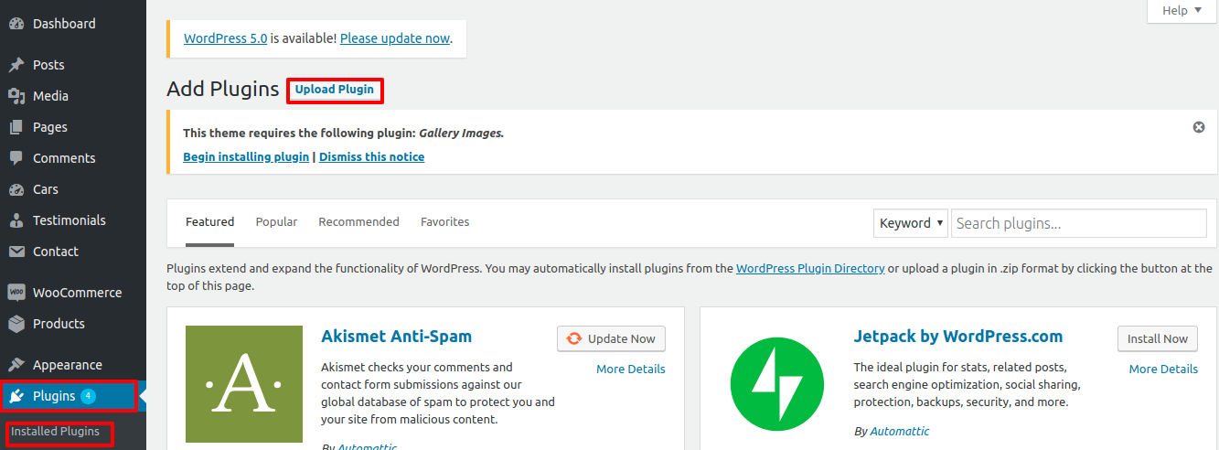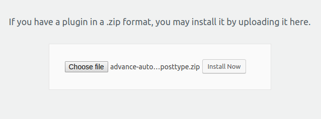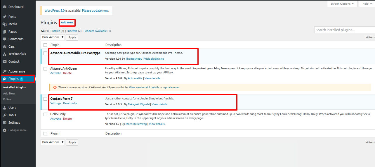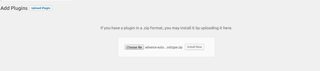 To begin, download the advance-automobile-pro Posttype plugin as a zip file from the source. Next, navigate to WordPress admin and select Plugins >> Add new.