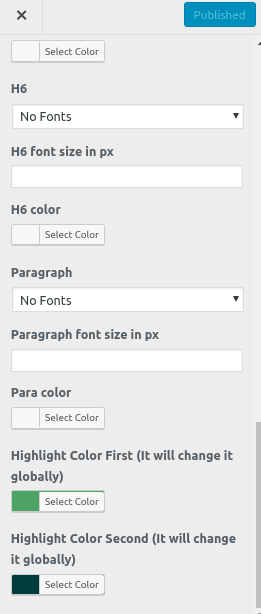 Depending on the number of options available in that section, each individual section has the option to set the colour palette for Headings,Title/Text,Paragraph,Button Text, and Button Background.