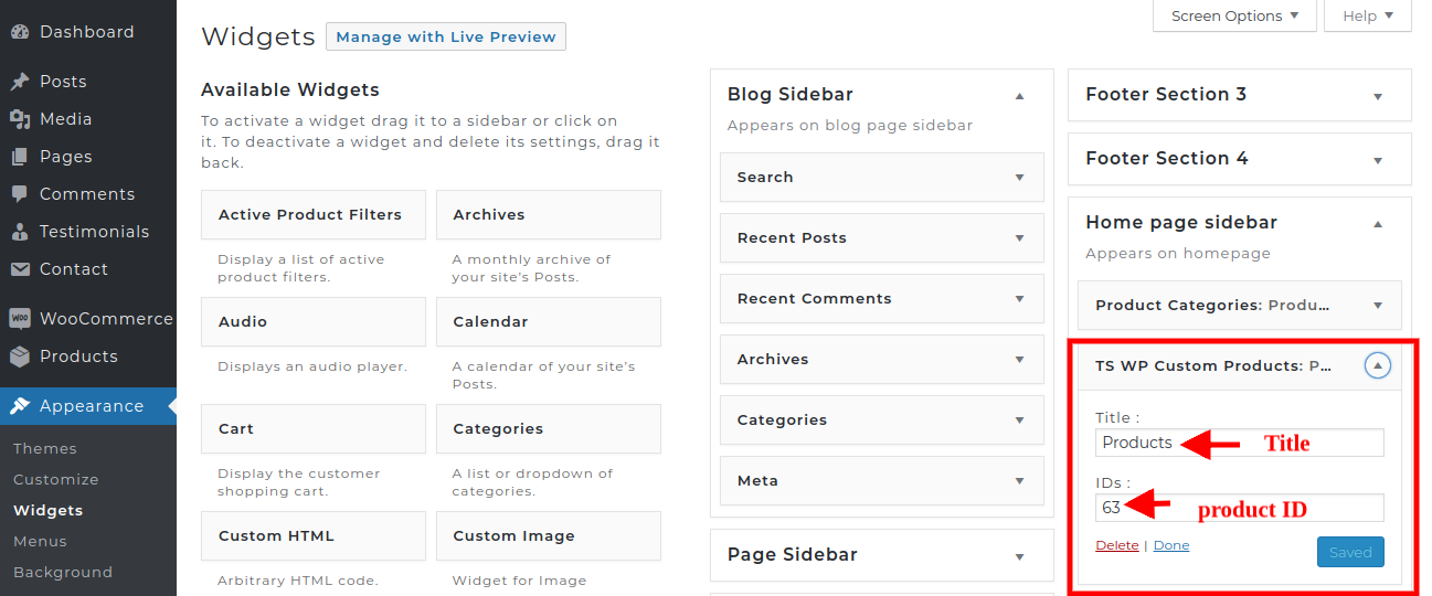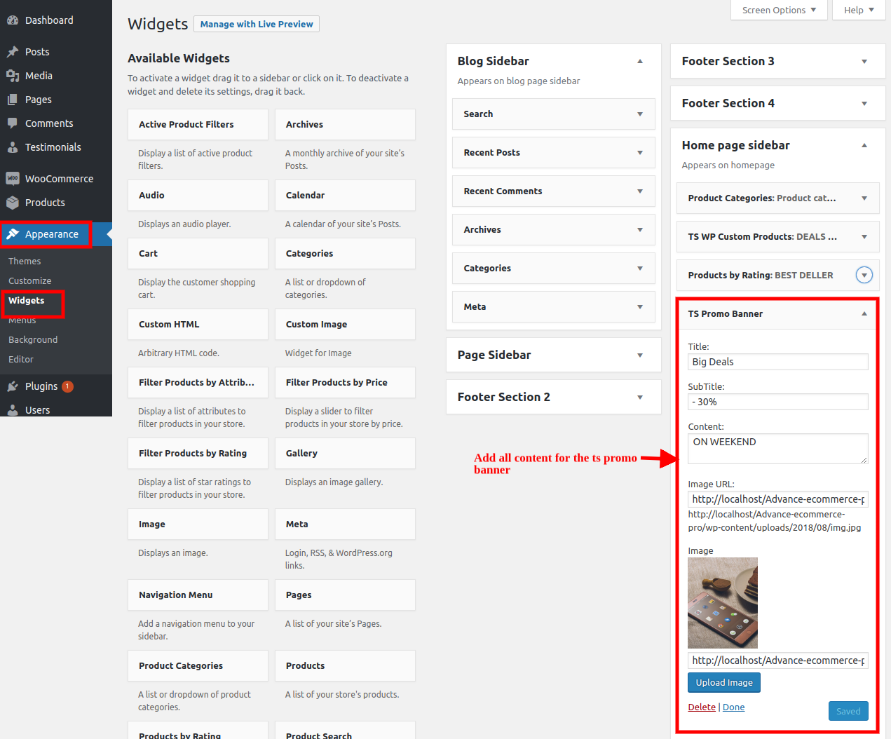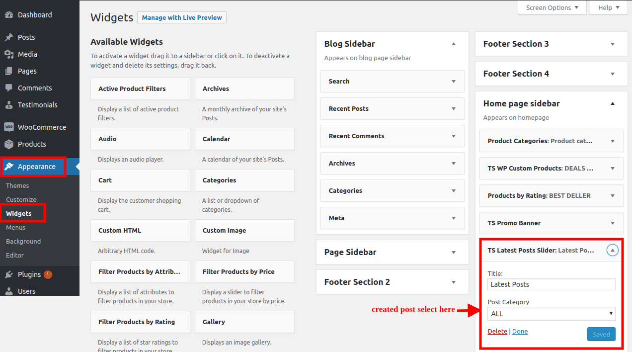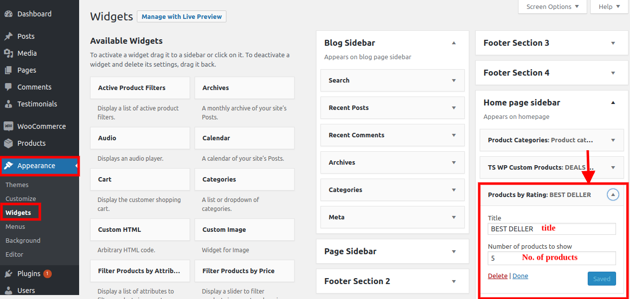 To set up the Home Page sidebar, first activate the woocommerce pluging and then proceed.