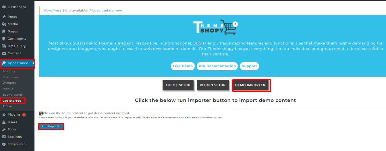 Click on"Demo Importer" and then "Run Importer".