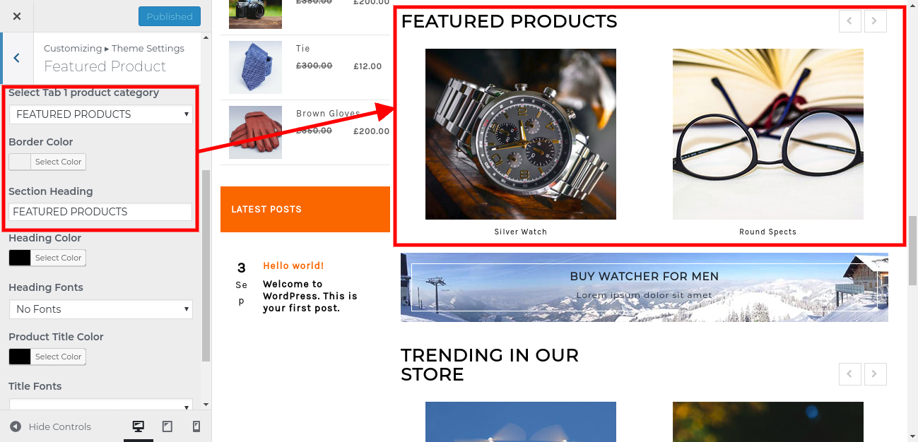 4. Go to Appearance >> Customize >> Theme Settings>> Featured Product.