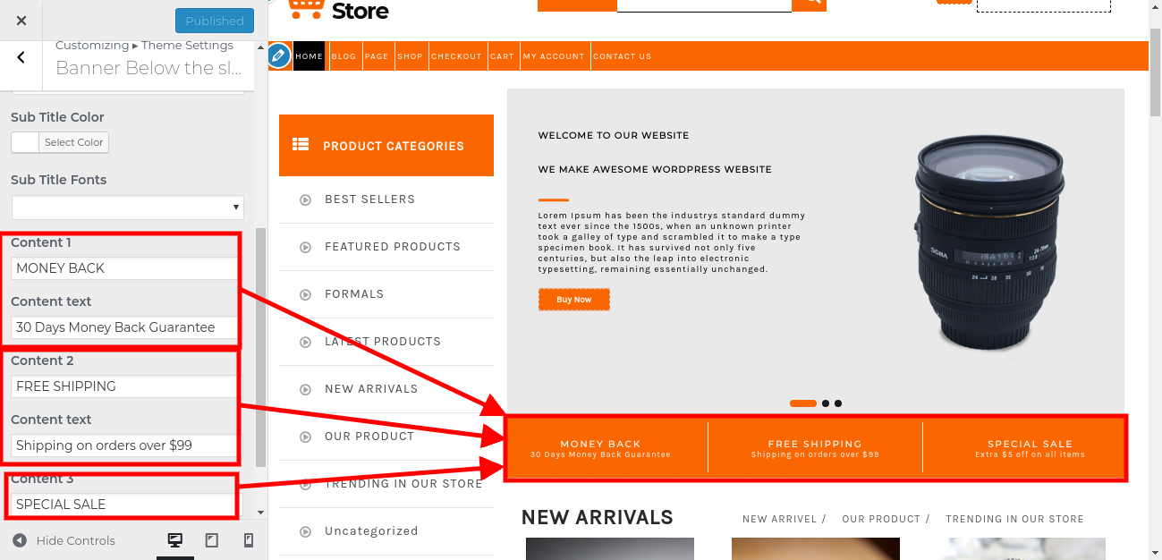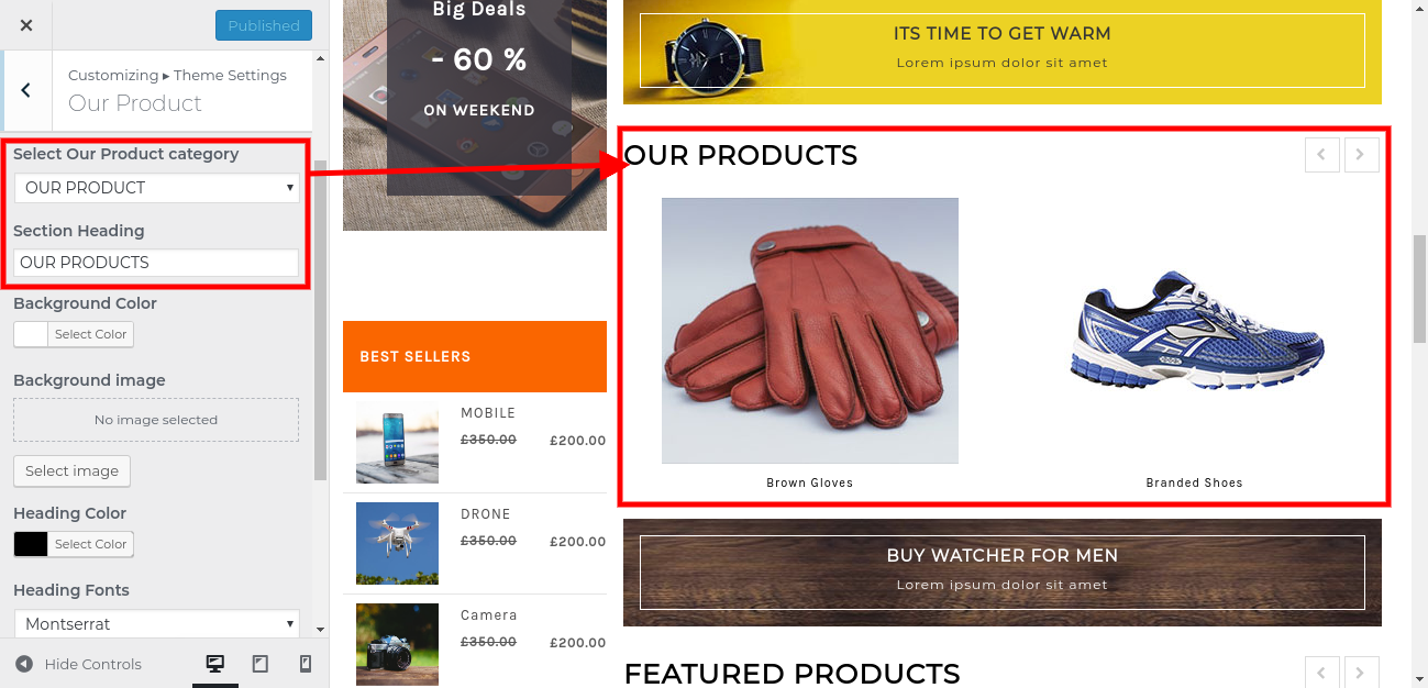 4. Go to Appearance >> Customize >> Theme Settings>> Our Product.