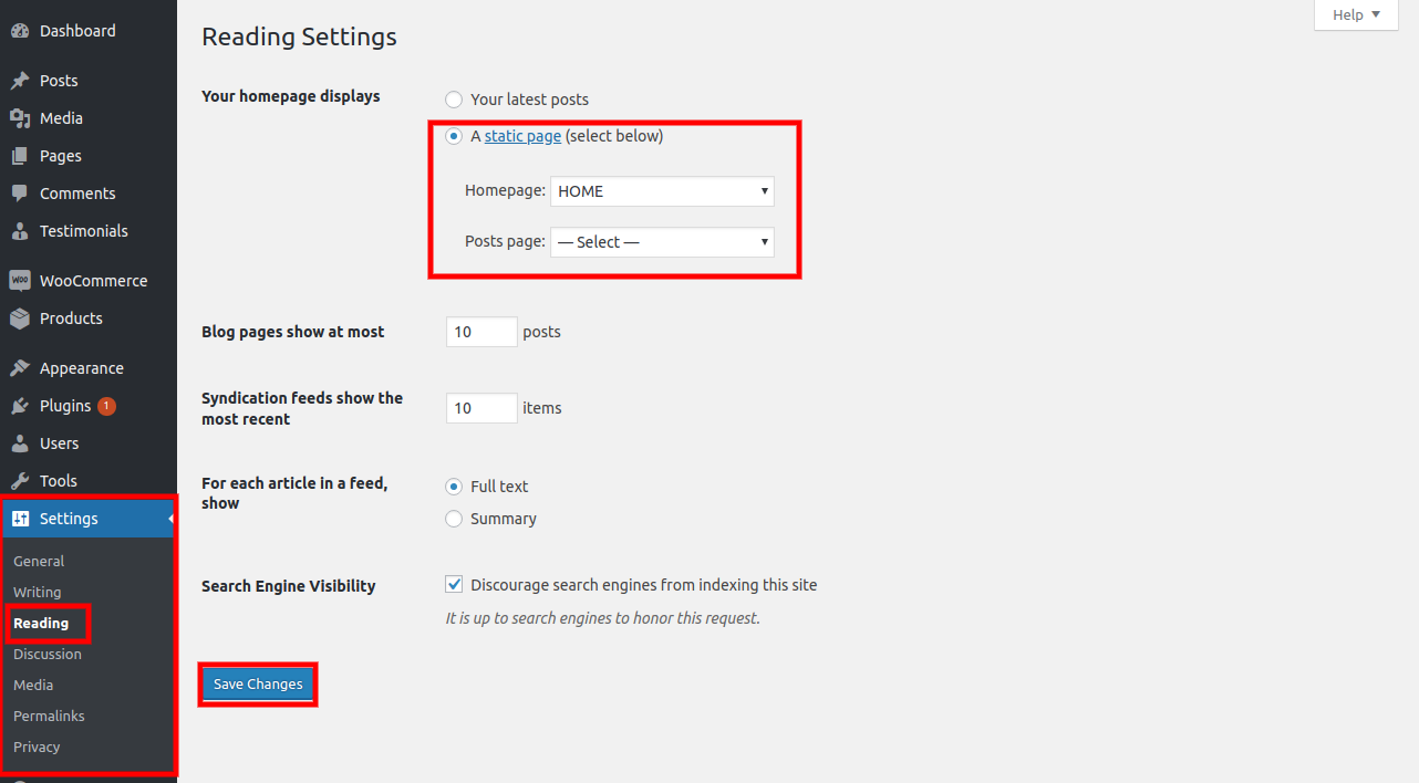 2. Set the front page: Go to Setting -> Reading --> Set the static front page display page to the home page.