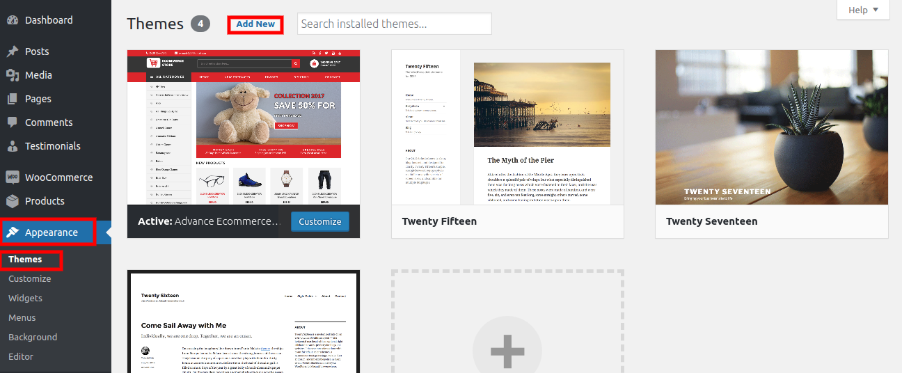 When you've arrived at the themes page, click the Add New button at the top.