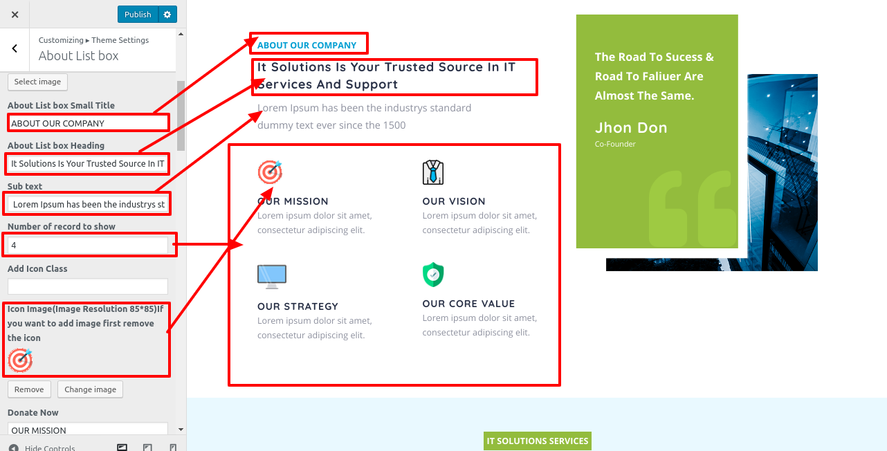 Go to Appearance >> Customize >> Theme Settings >> About List box Section.