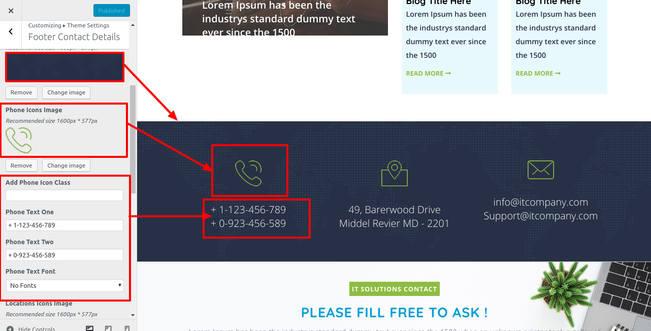 Go to Appearance >> Customize >> Theme Settings >> Footer Contact Details.