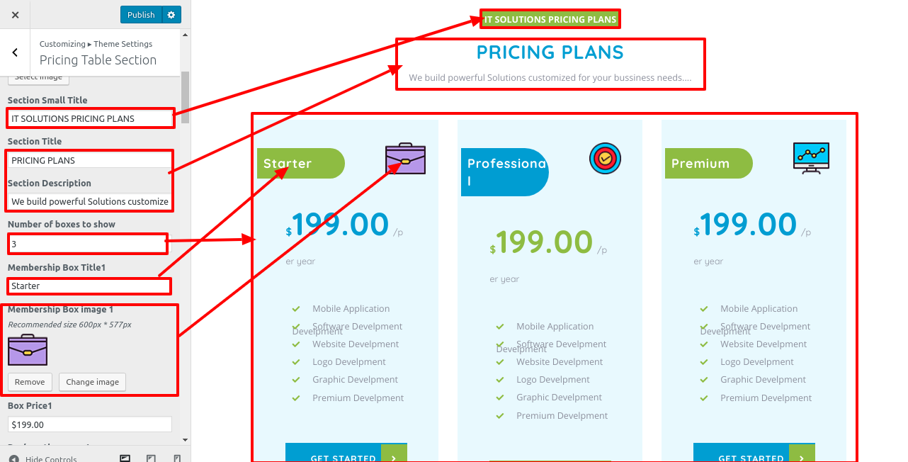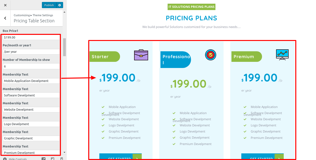 Go to Appearance >> Customize >> Theme Settings >>Pricing Table Section.
