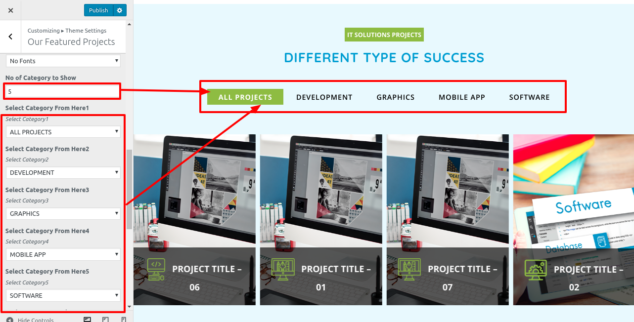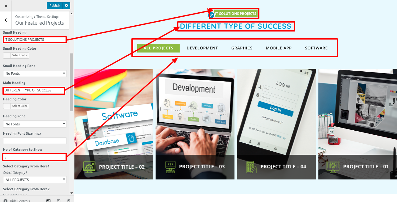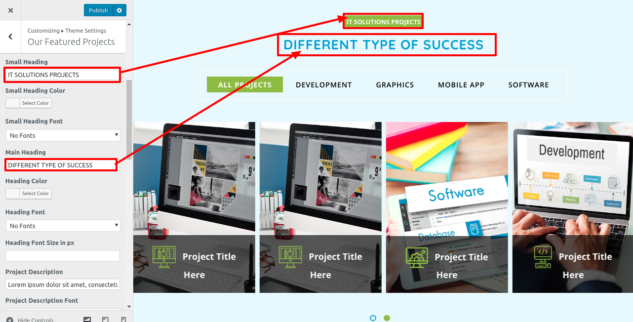 Go to Appearance >> Customize >> Theme Settings >> Our Featured Projects Section.