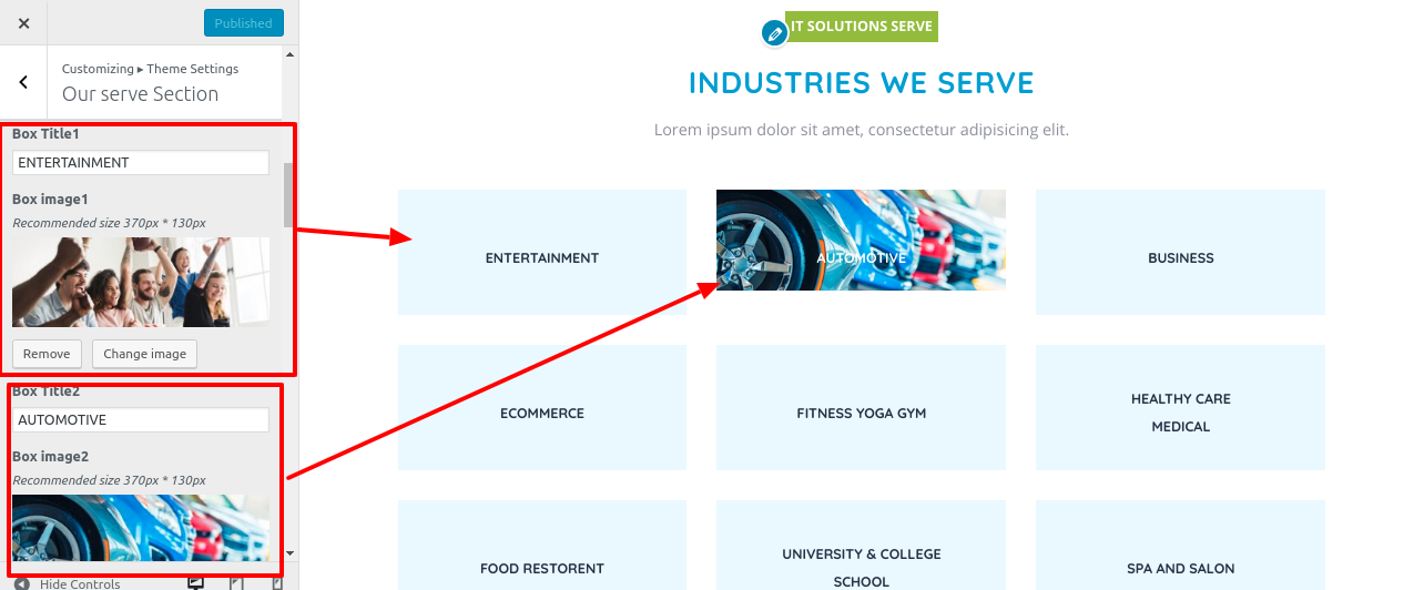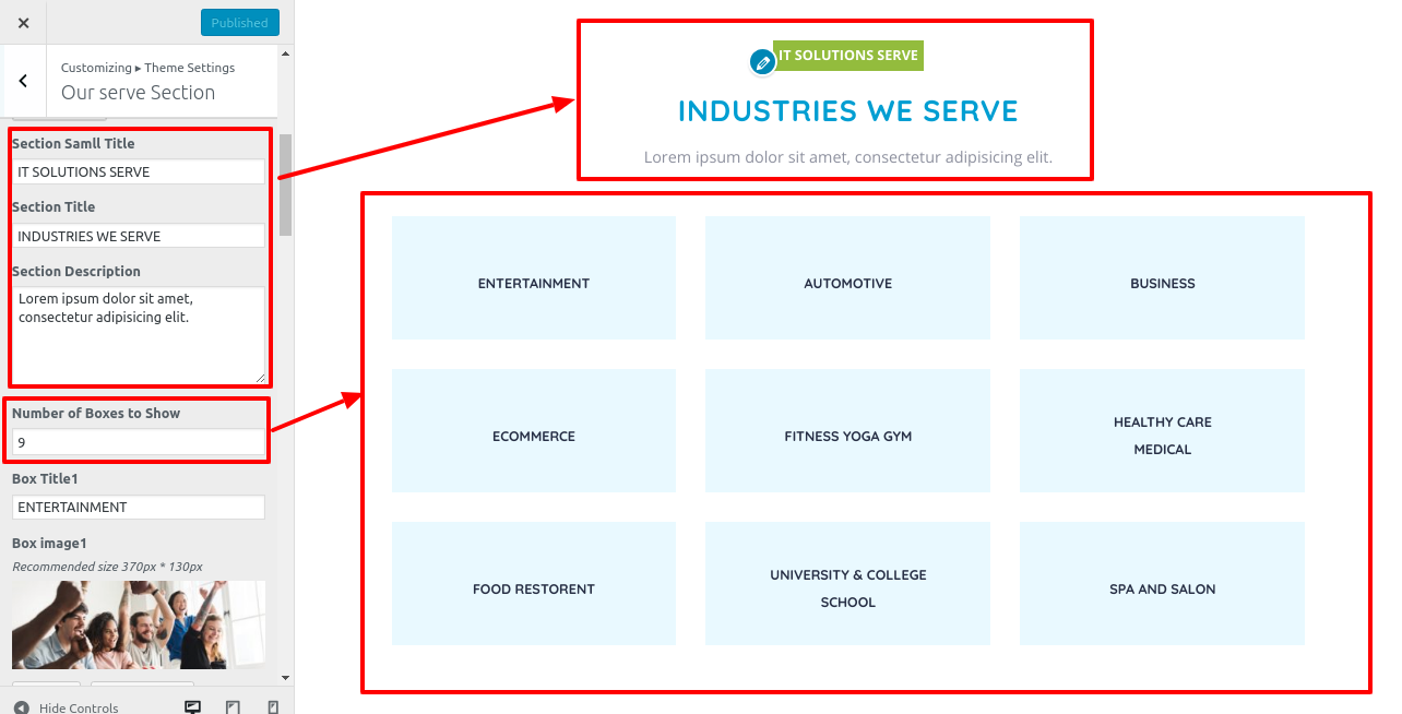 Go to Appearance >> Customize >> Theme Settings >> Our Serve Section.