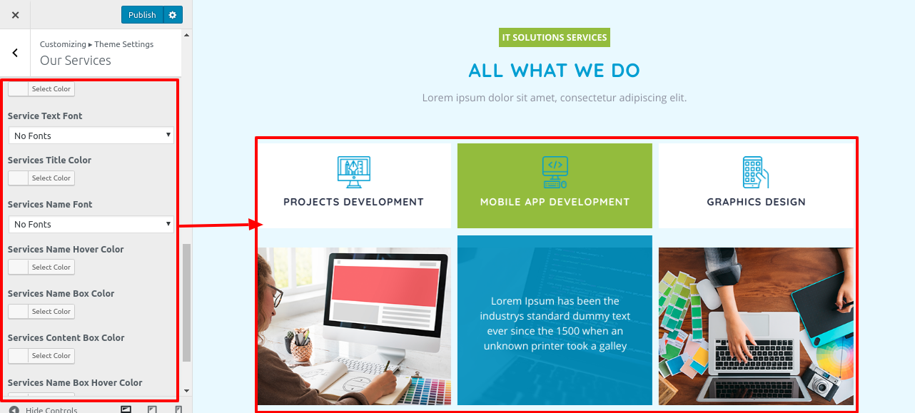 Go To Appearance >> Customize >> Theme Settings >> Our Services Section.