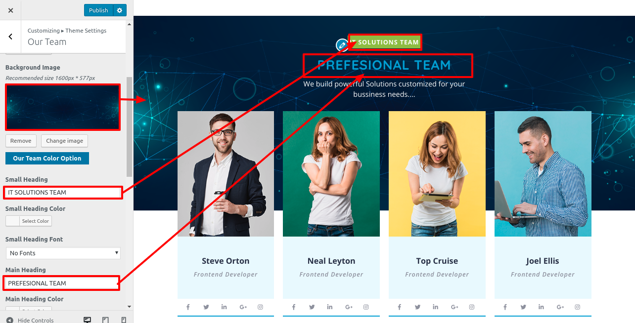 Go to Appearance >> Customize >> Theme Settings >> Our Team