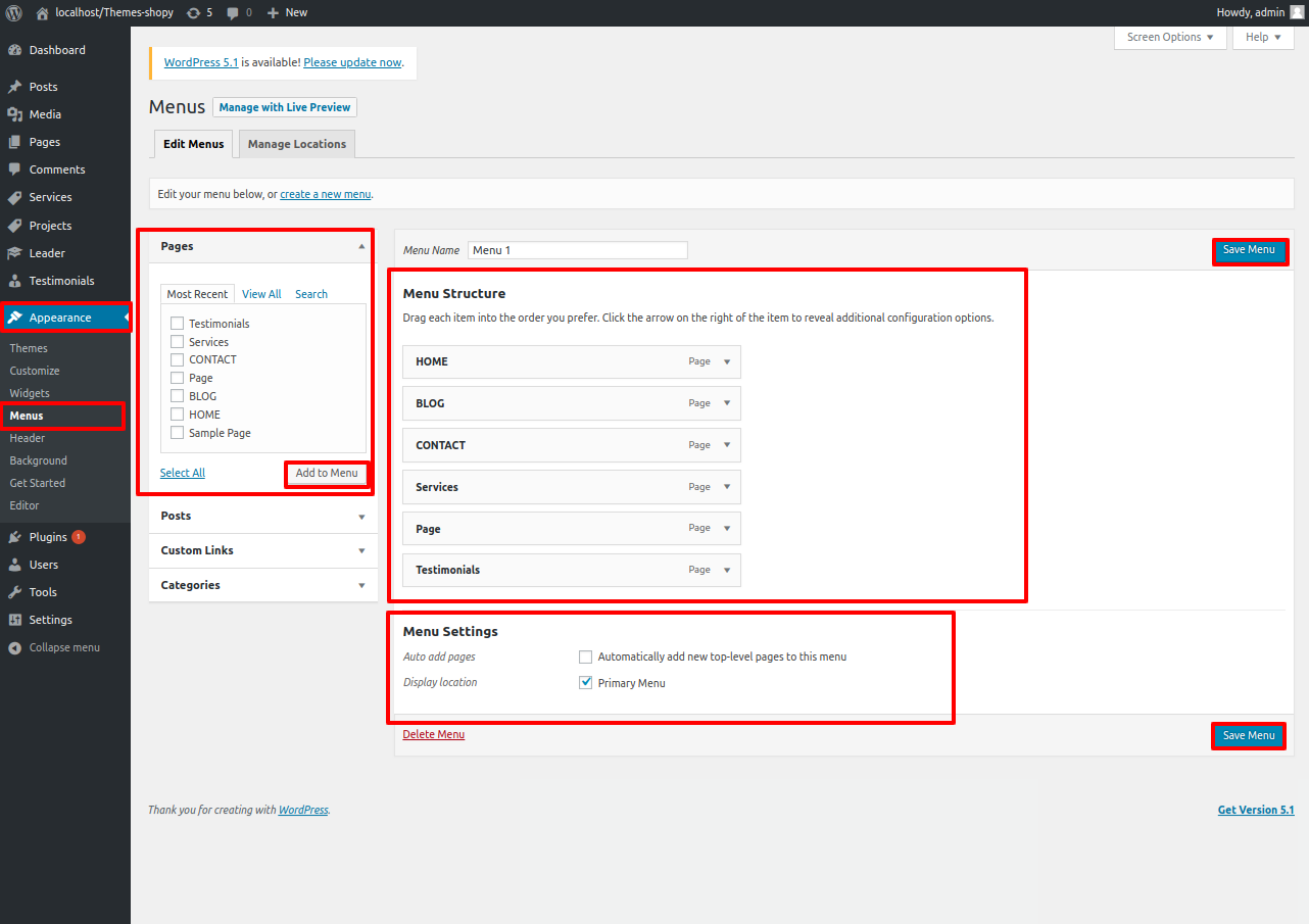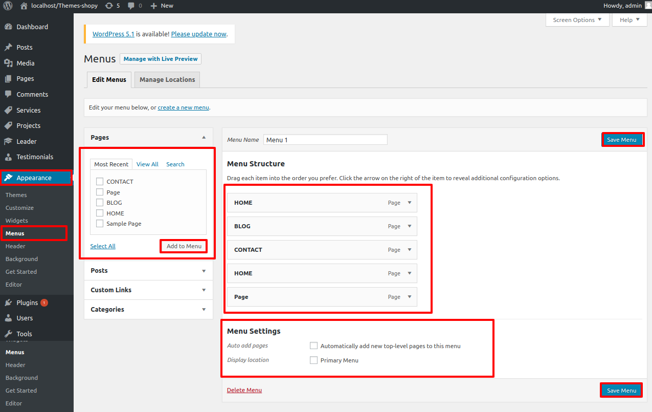 If the primary menu checkbox is selected, the menu will appear in the header; if the footer checkbox is selected, the menu will appear in the footer.