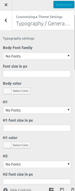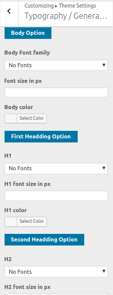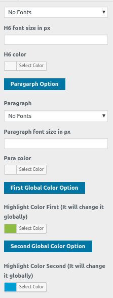 Depending on the number of options available in that section, each individual section has the option to set the color palette for Headings,Title/Text,Paragraph,Button Text, and Button Background.