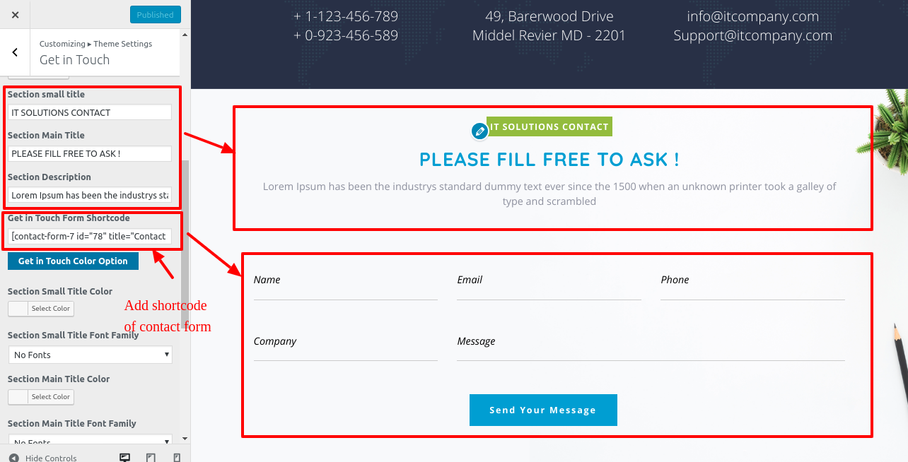 Go to Appearance >> Customize >> Theme Settings >> Get in Touch Section.