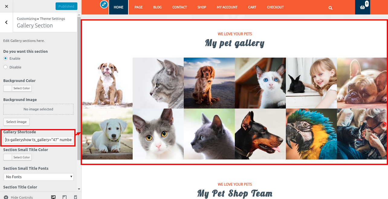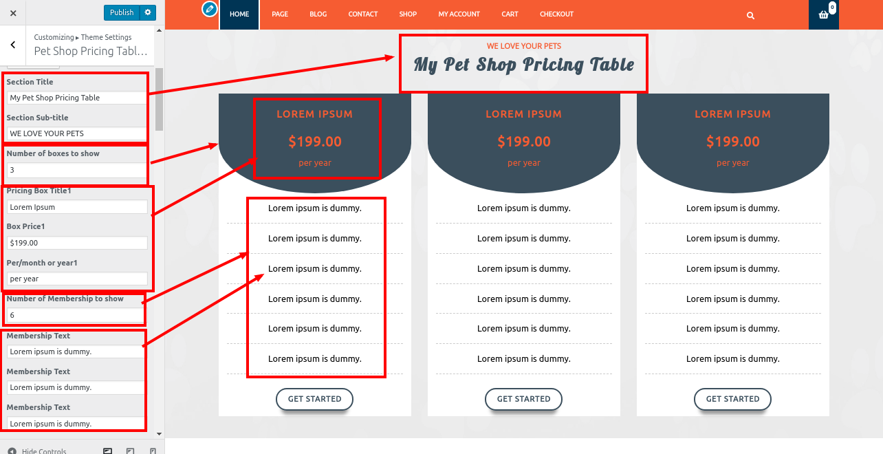 1. Go to Appearance >> Customize >> Theme Settings>> Pet Shop Pricing Table.