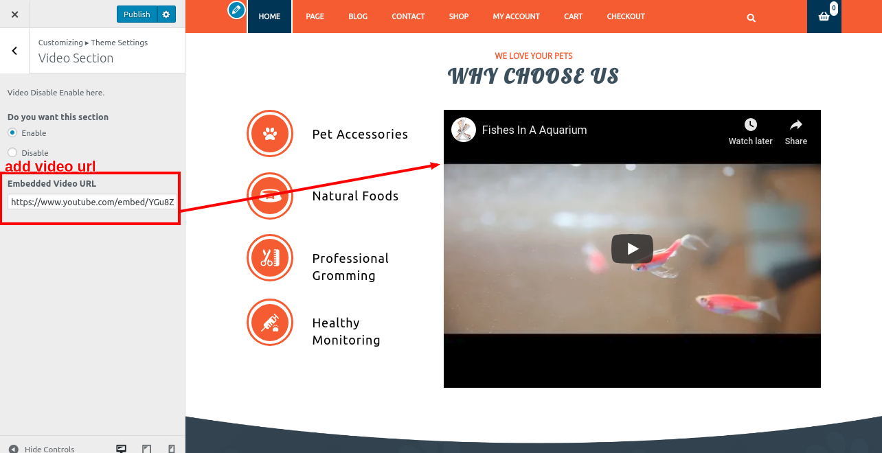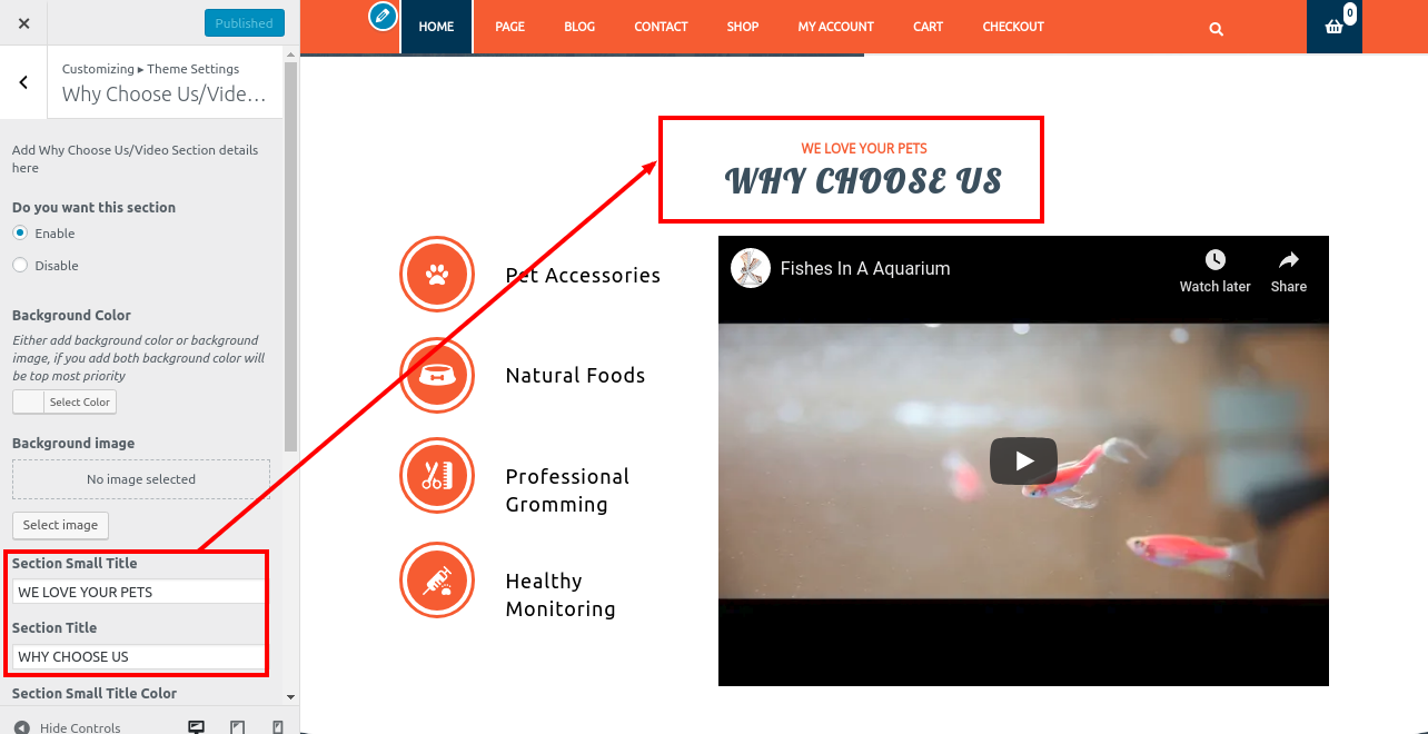 1. Go to Appearance >> Customize >> Theme Settings>> Why Choose Us/Video Section .