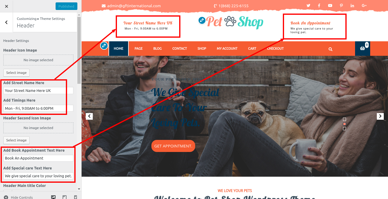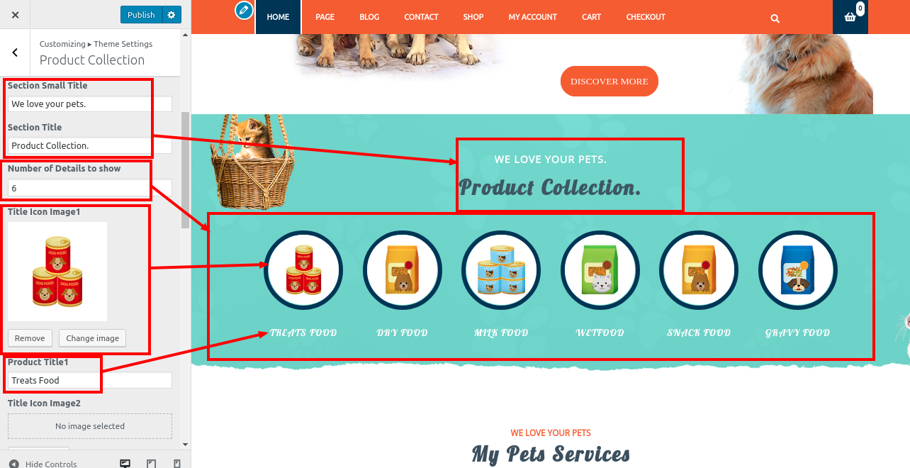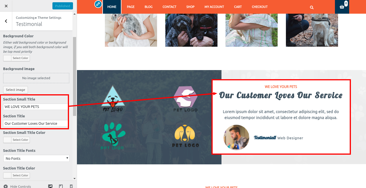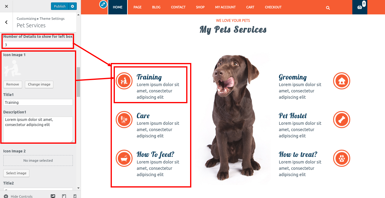2. Go to Appearance >> Customize >> Theme Settings>> Pet Services Section.
