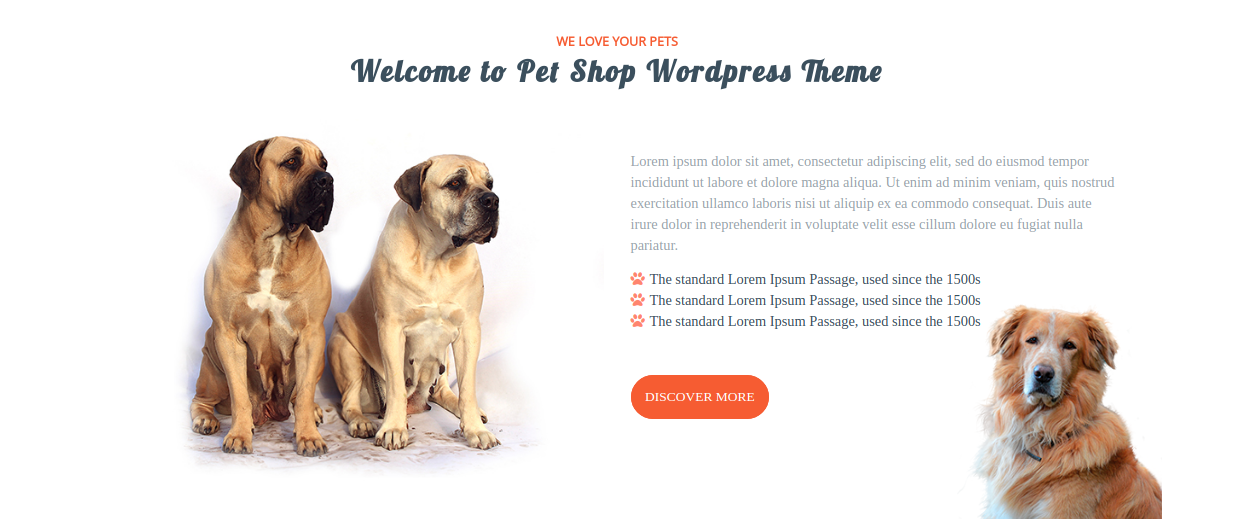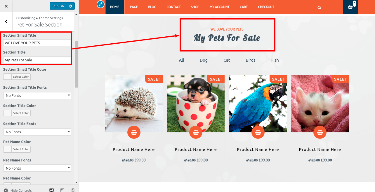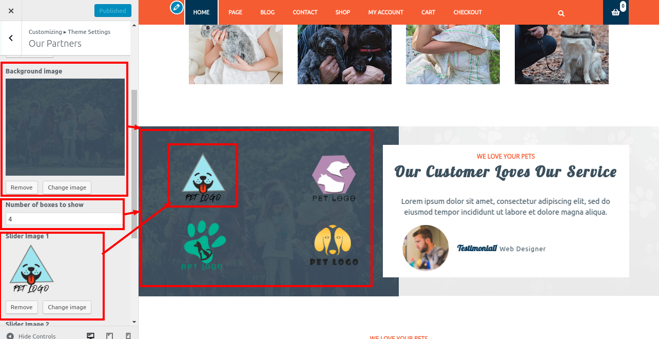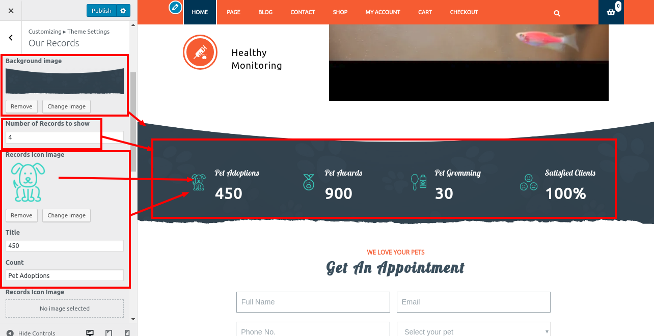 2. Go to Appearance >> Customize >> Theme Settings>> Pet Services Section.