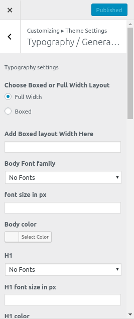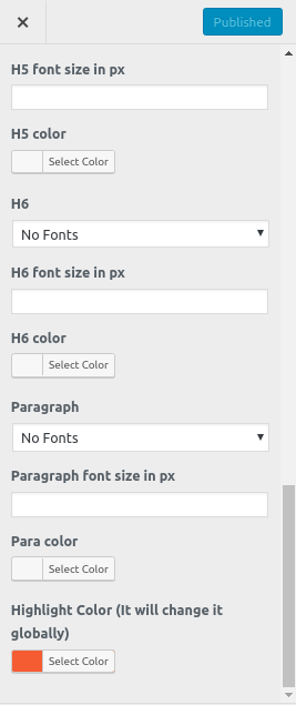 Depending on the number of options available in that section, each individual section has the option to set the color palette for Headings,Title/Text,Paragraph,Button Text, and Button Background.