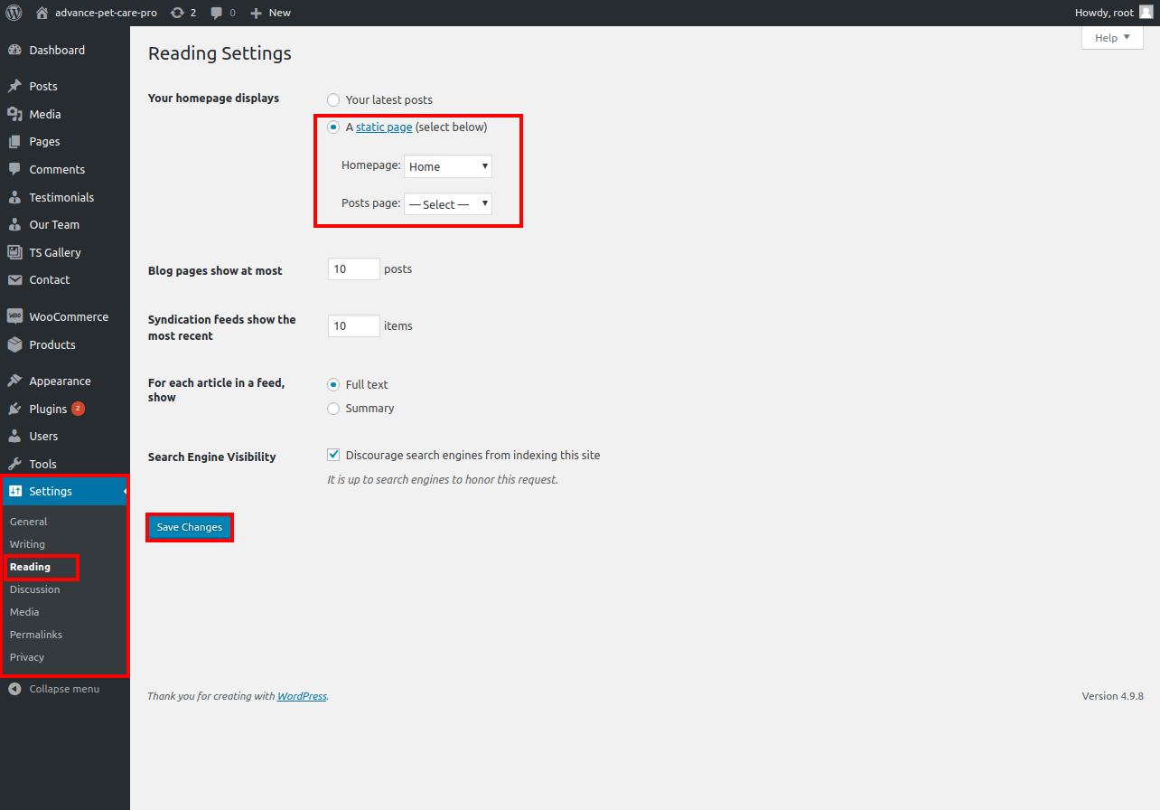 2. Set the front page: Go to Setting -> Reading --> Set the front page display static page to home page.
