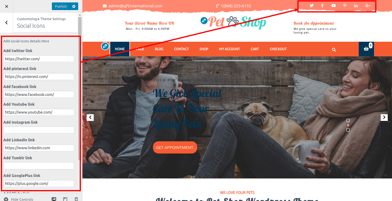 Go to Appearance >> Customize >> Social Icons Section.