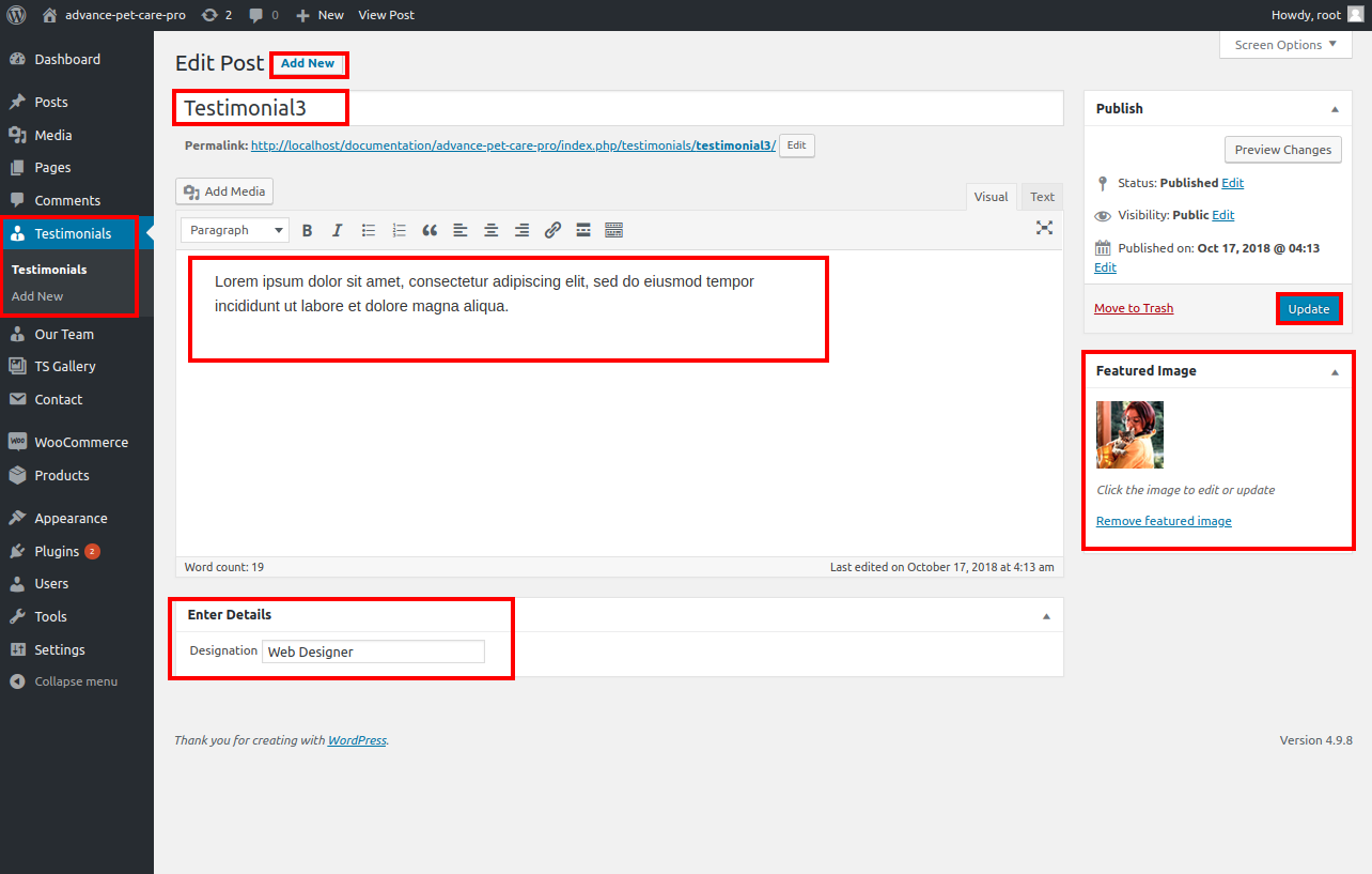 Go to >>Dashboard>>Testimonials>>Add new