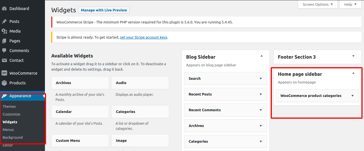 Go to Dashboard >> Appearance >> Widgets >> Home Page sidebar.