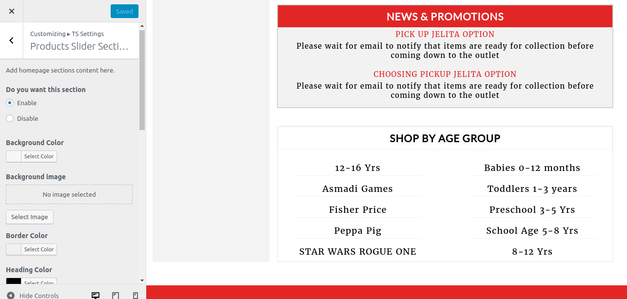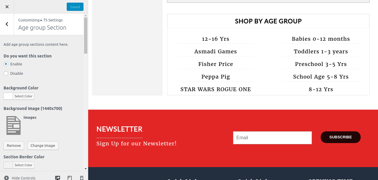 Go to Appearance >> Customize >> TS Settings>> Shop By Age Group Section.