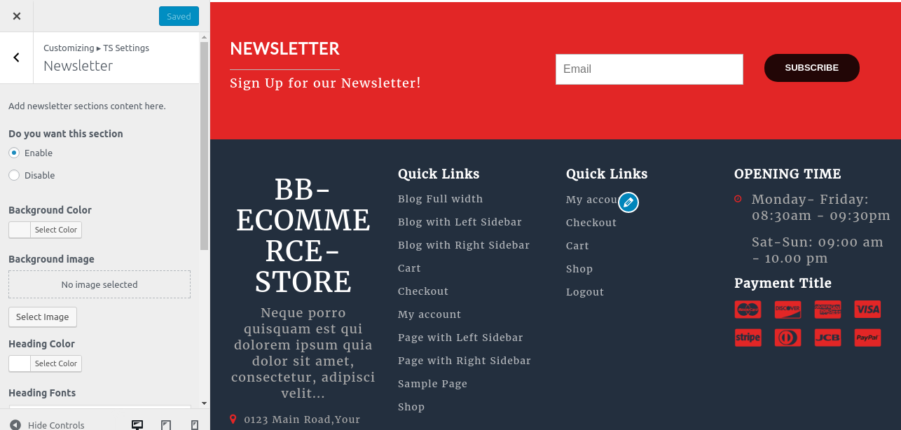 Go to Appearance >> Customize >> TS Settings>> Newsletter.