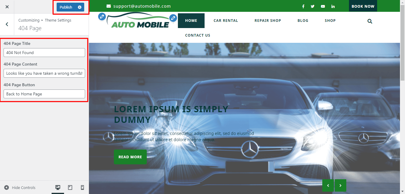 Go to Appearance >> Customize >> Themes Settings >> 404 Page