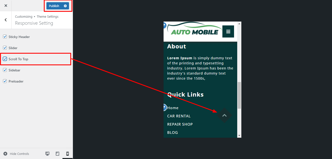For Enable / Disable scroll to top for mobile device or responsive media click on checkbox .