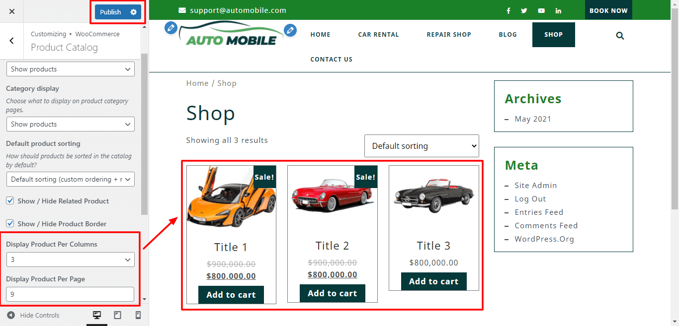 Here You have an option to add select the Number Of Product in one Row and single page.