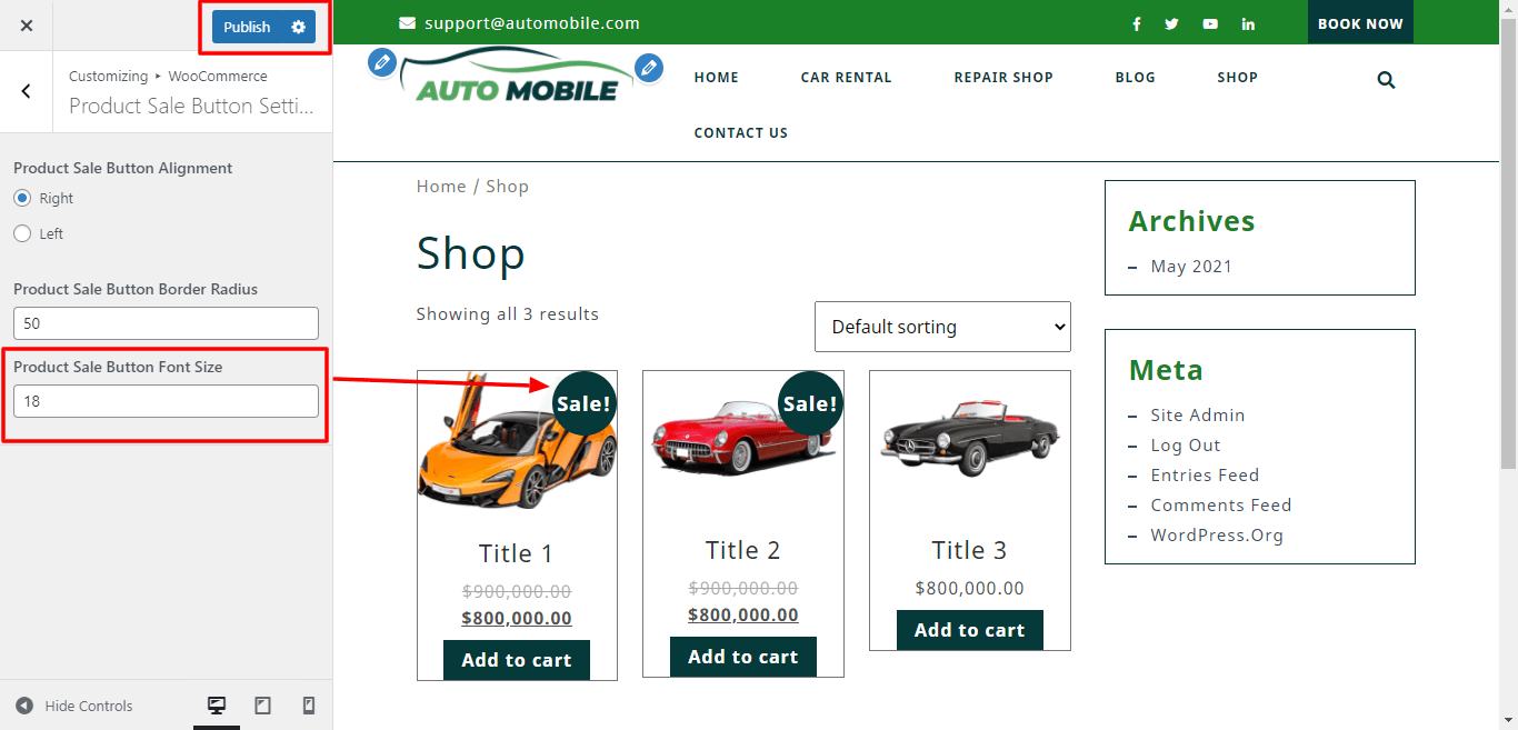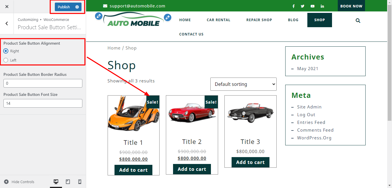 Go to Appearance >> Customize >> Woocommerce >> Product Sale Button Settings
