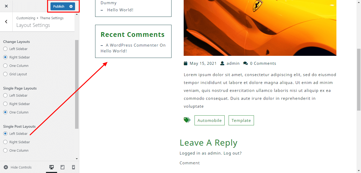 In Layout Settings, you can select the Blog Post Layout Sidebar.
