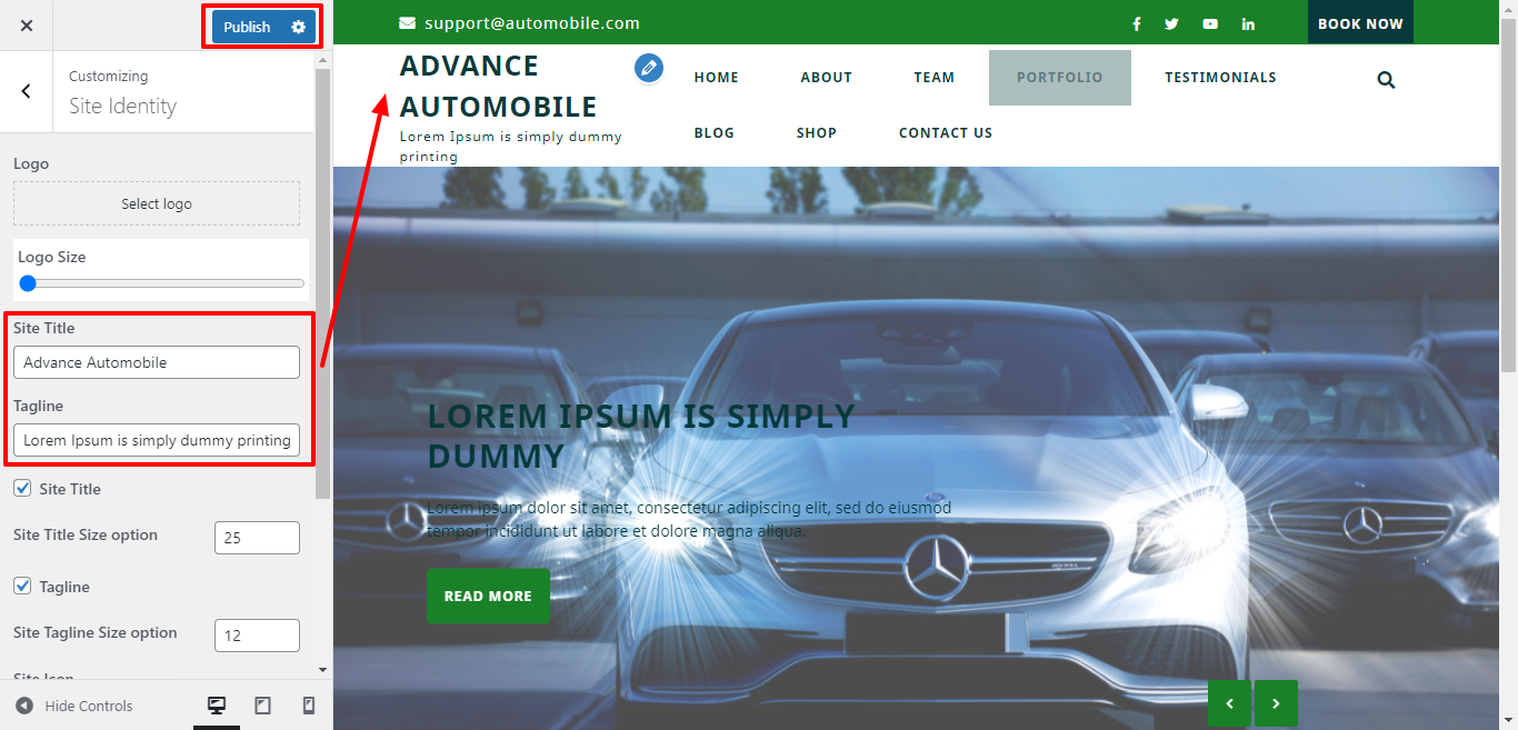 For show / hide site title and tagline for the theme, click on the checkbox for the theme.