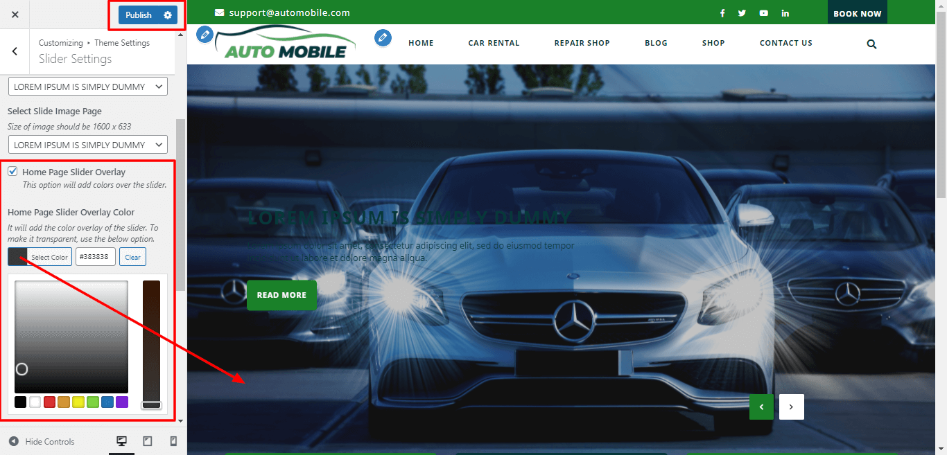 Here You can select show / hide slider image overlay and select the Background color, for Slider Image display transparent.