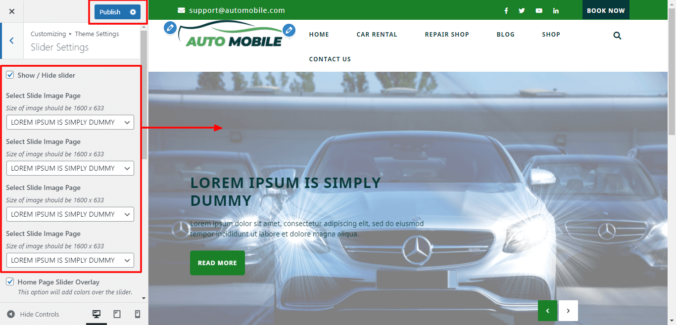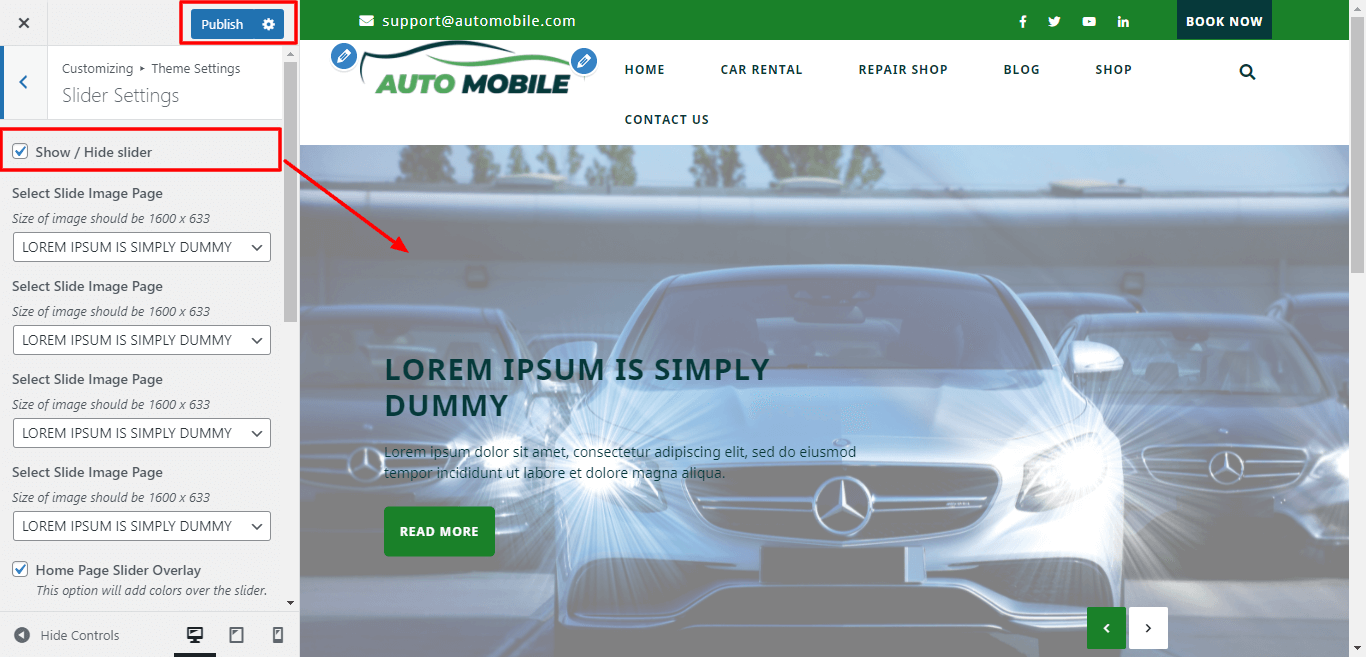 Go to Appearance >> Customize >> Themes Settings >> Slider Settings