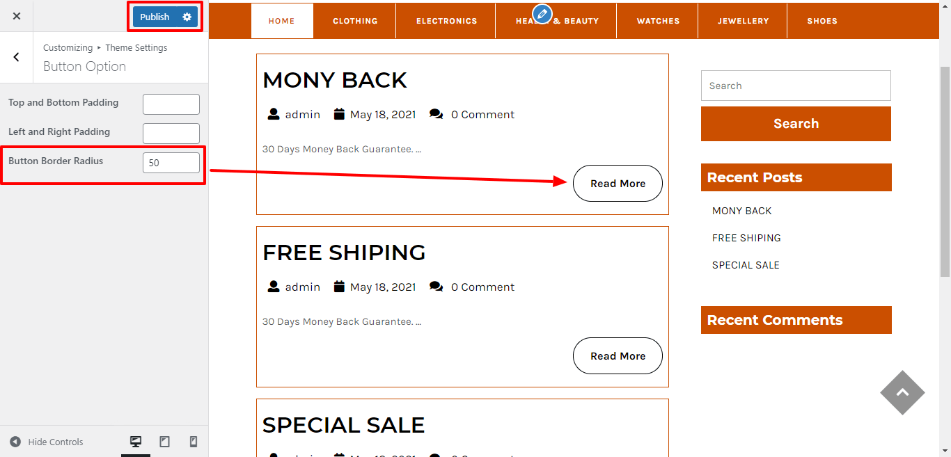 Go to Appearance >> Customize >> Theme Settings >> Button Options