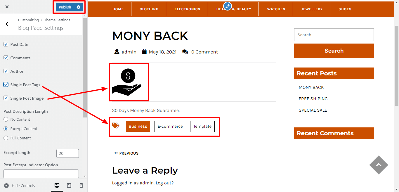 For show/hide single post tags and single post image, click on the checkbox for the theme.