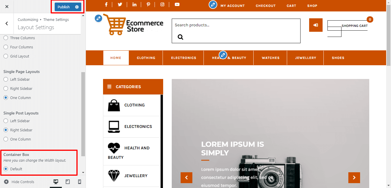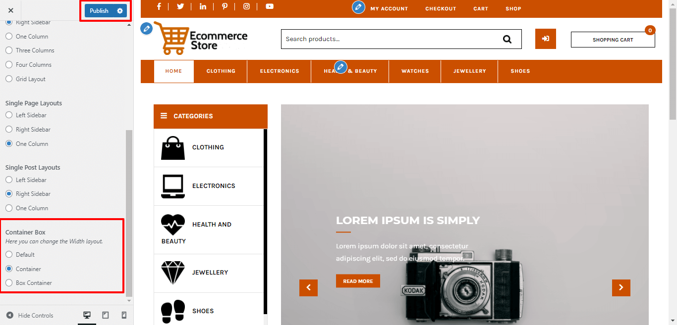 Here You can select the Container layout for the themes.