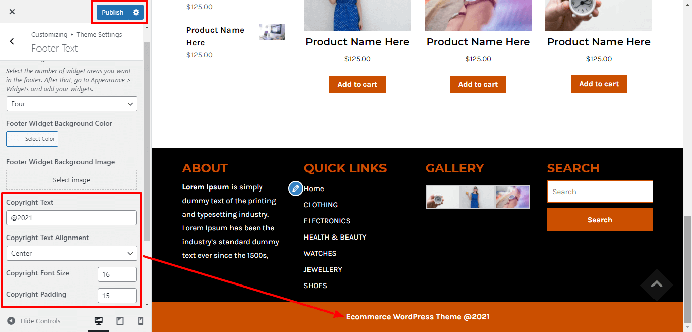 Here you can add the copyright text , copyright text alignment, copyright font size and padding for copyright text.