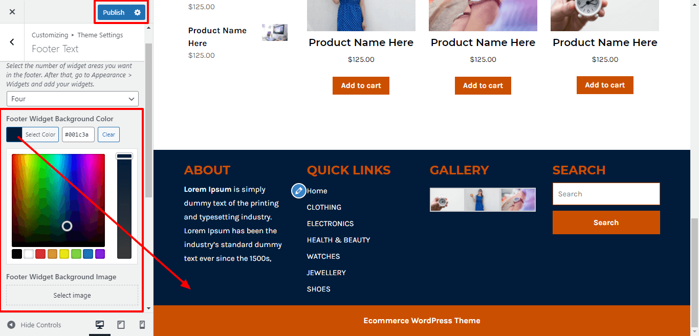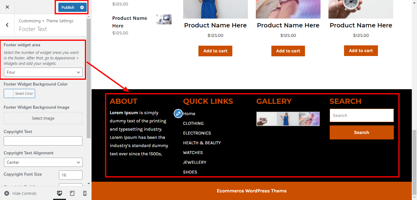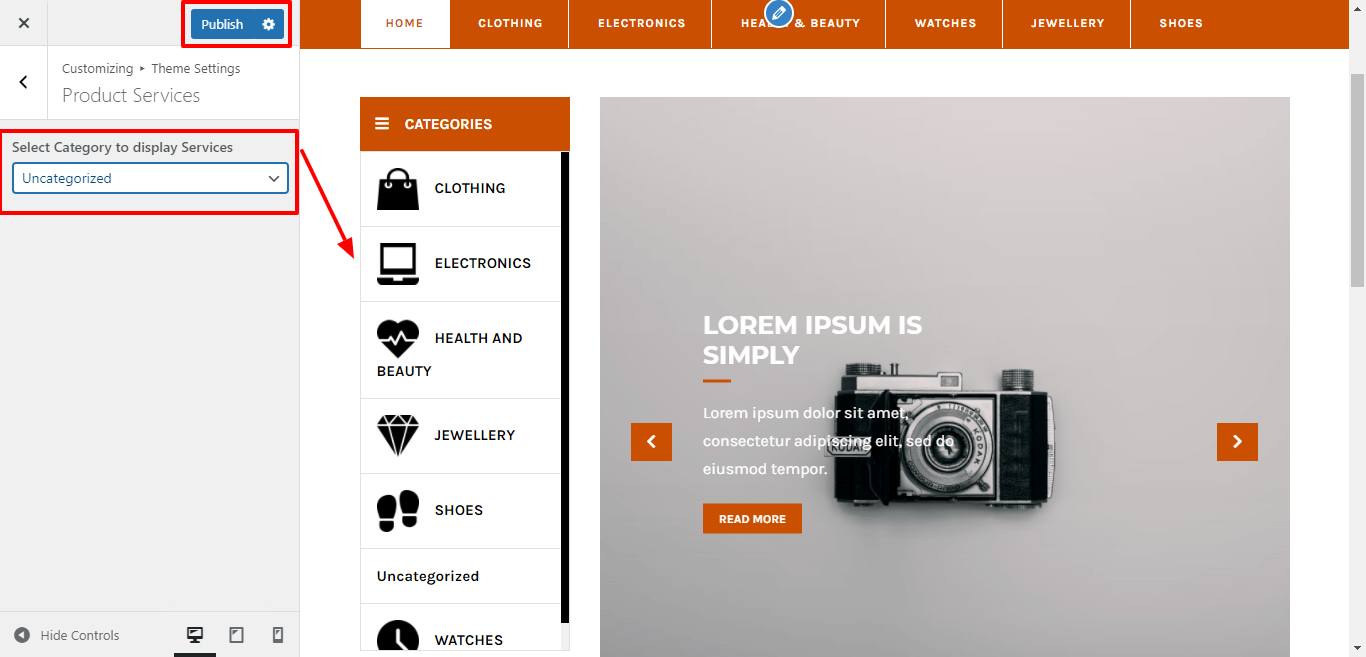 3. Go to Appearance >> Customize >> Theme Settings >> Product Services