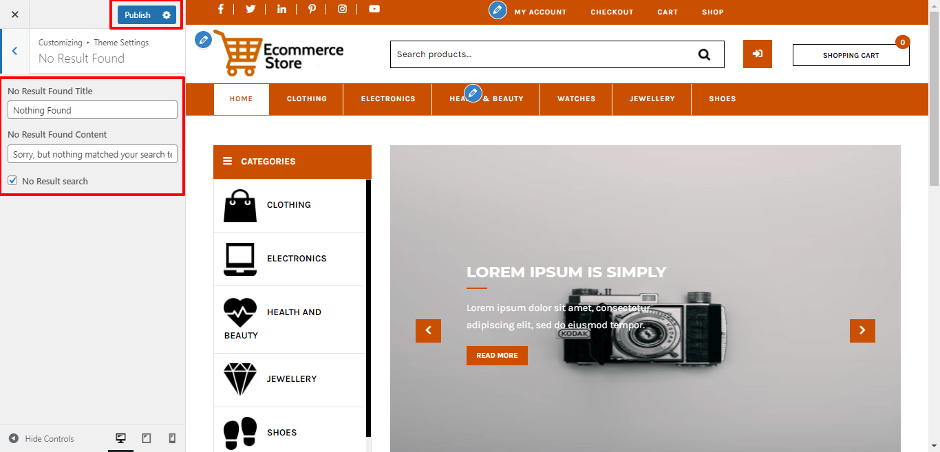 Go to Appearance >> Customize >> Themes Settings >> No Result Found