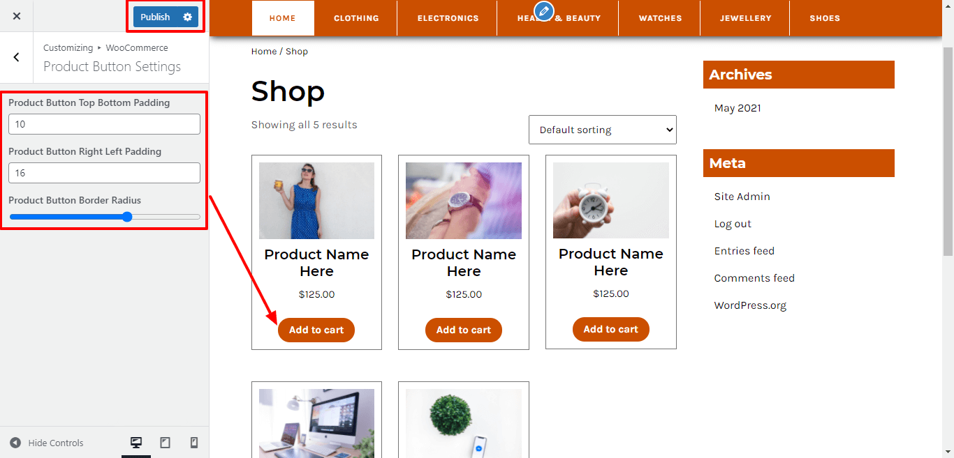 Here You have an option to add top-bottom, left-right padding product button and radius of product button for theme.