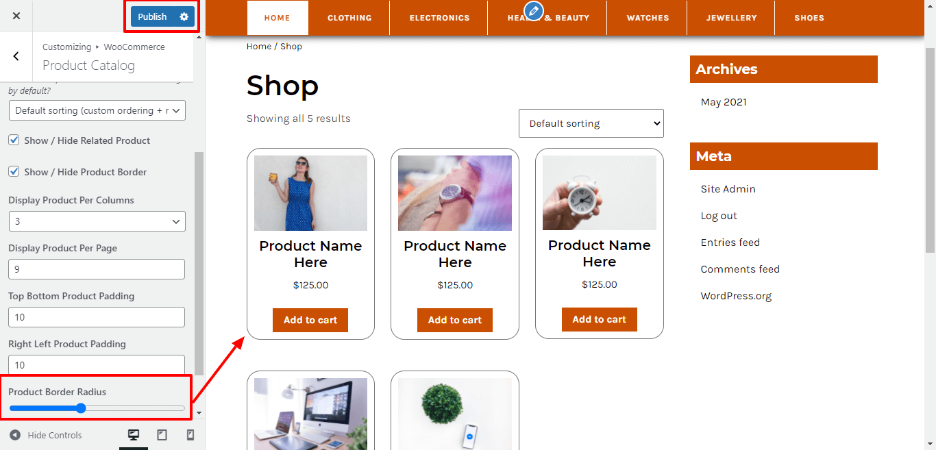 Here You have an option to give border radius to product.