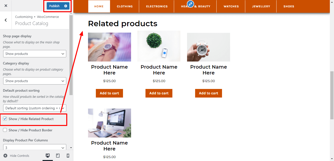 Here You have an option to Enable / Disable Feature Related product of shop page by click on checkbox.
